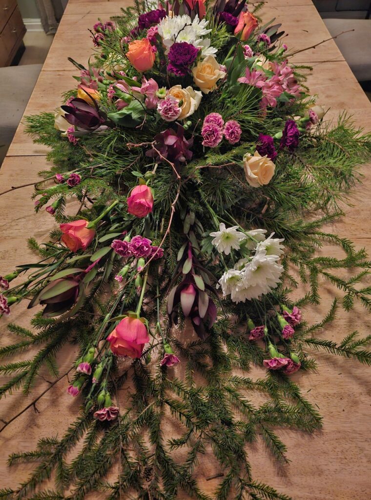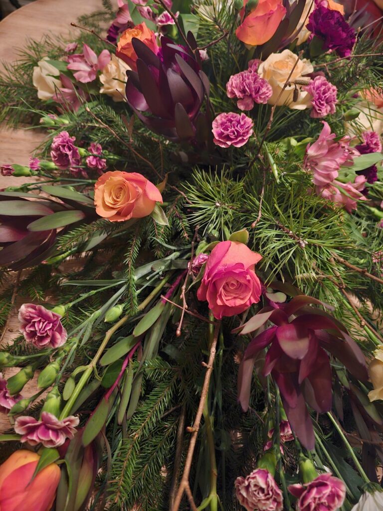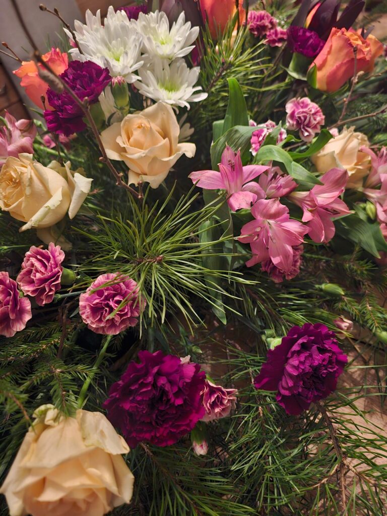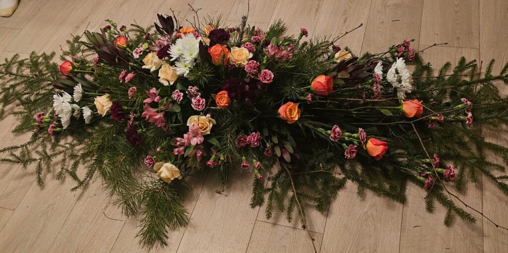 Av og til har tilbudt meg å hjelpe en familie som har mistet et kjært familiemedlem, eller en kjær venn. De synes det var en fin og god opplevelse og bli med å lage personlige hilsener selv. Det er flere som har fortalt at dette burde jeg tilby flere. Noe ble hentet fra privat hage, som gjør at det oppleves nærere. De skrev en hilsen med egen håndskrift på sløyfe båndet. Sløyfe båndene er ikke med på bildene, fordi dette er veldig privat.