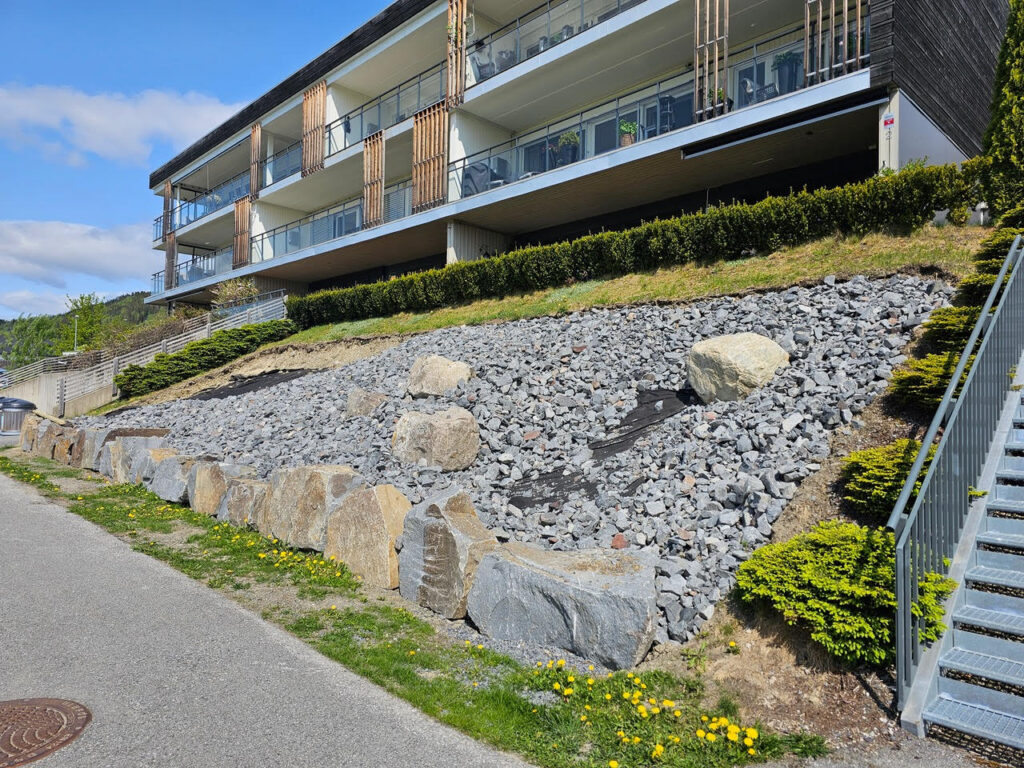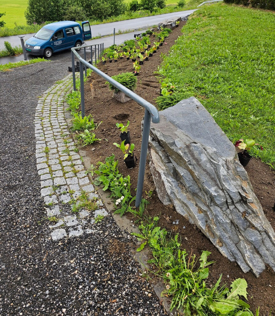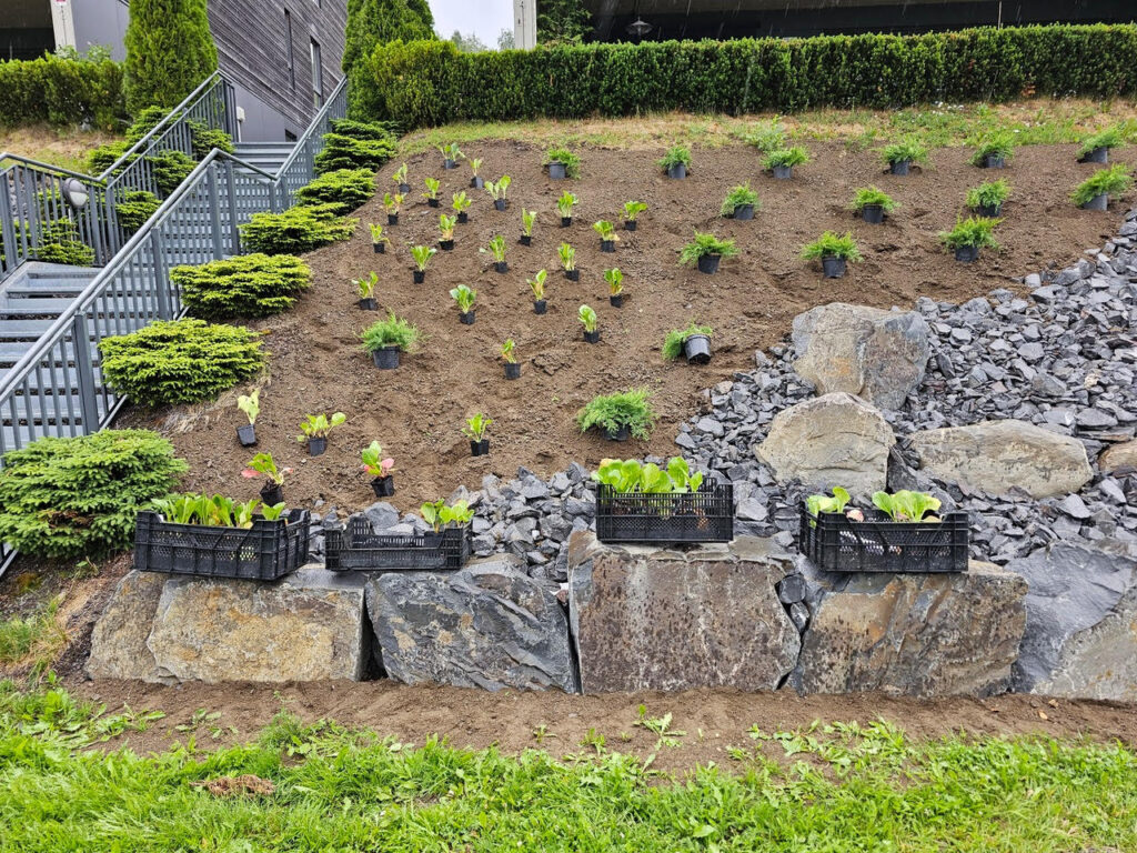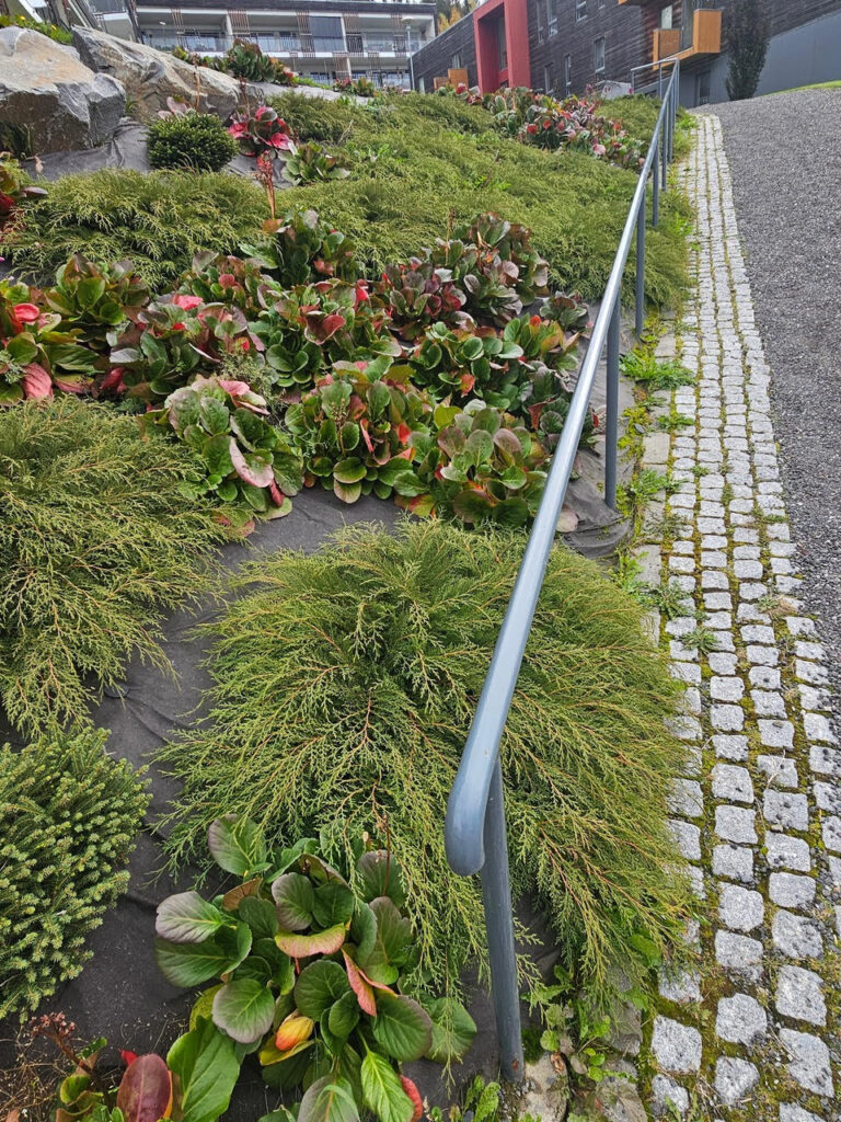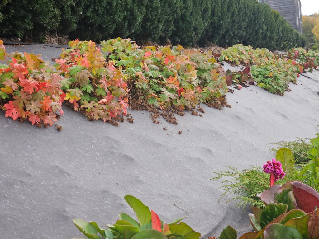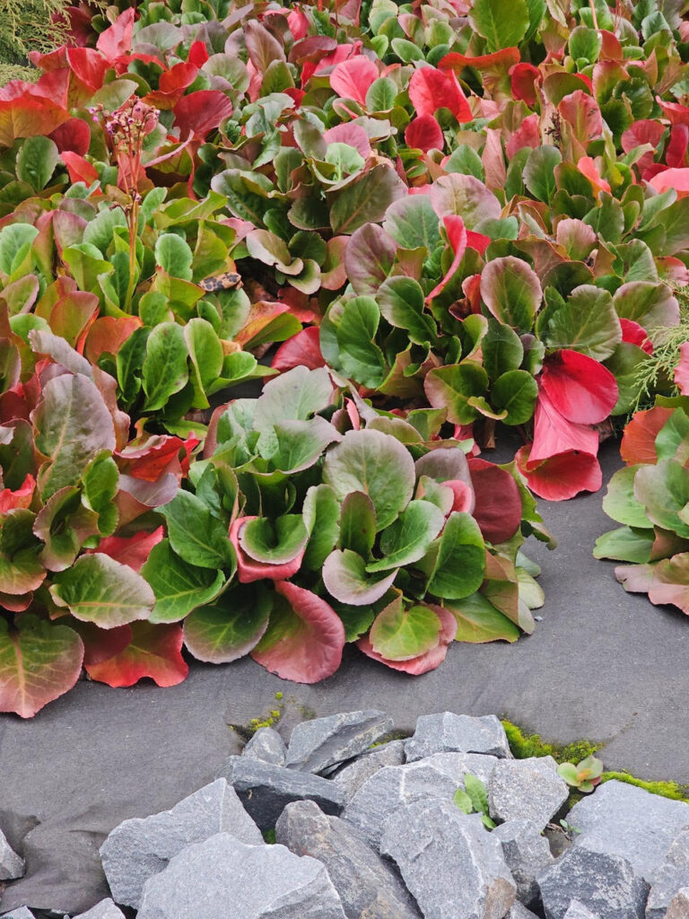 Plantet hardføre stauder som, som Bergenia. tåler tørr jord og solskinn. Mikrobiota er hardføre, og dekker bakken godt.