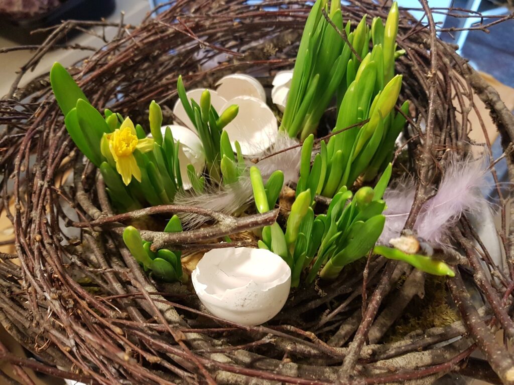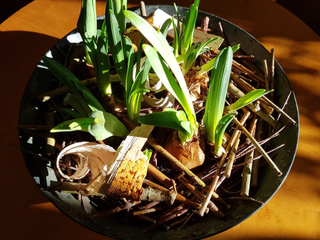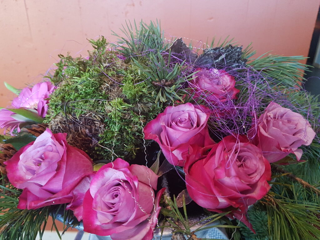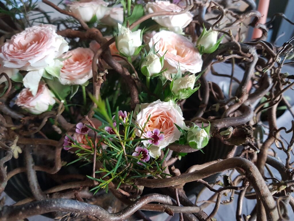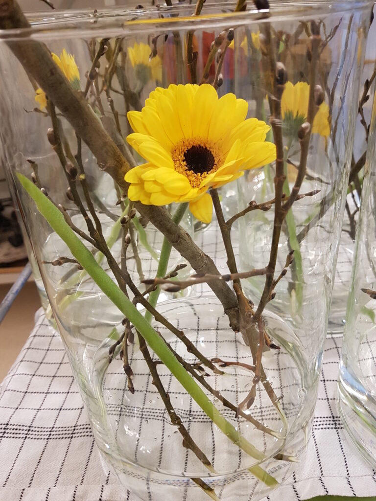 Bruk det man har, gjerne noe fra naturen – kontraseter er fint (rustikt mot myke blomster).