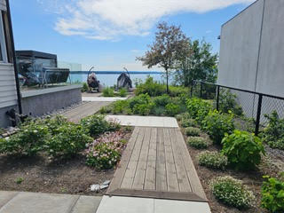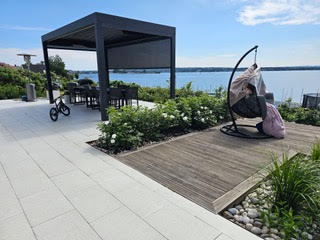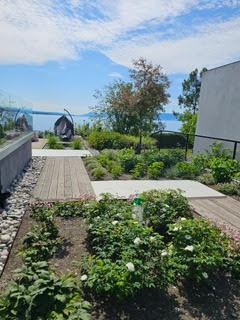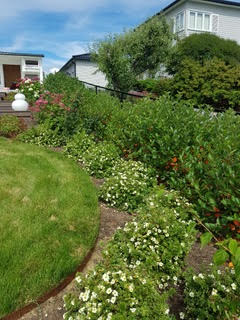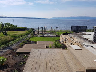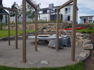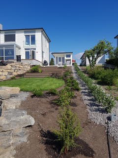 Flott trapp og buete former, masse frodige blomster. Sitteplass, eller soldekk – som ligner på båt. Mye frodigere, og stramme former, som passer til huset. Ny gardplass, for å snu bilen. Stier og nye trapper, og ny mur. Utvidet sitteplassen opp mot huset. Bålpanne, som kunden har designet selv.
